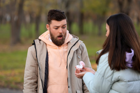 Scared woman rejecting her surprised boyfriend after marriage proposal in a park