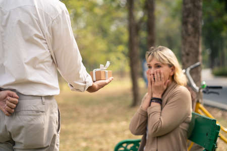 Elder senior retirement couple lifestyle in park, old man giving small gift box behind to make a surprise to woman sitting on armchair. Husband give birthday or anniversary present for lovely wife.