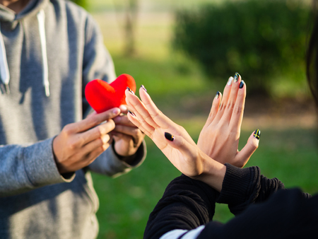 Woman refusing red heart form the man. Broken heart, Love, Valentine'sDay Concept.