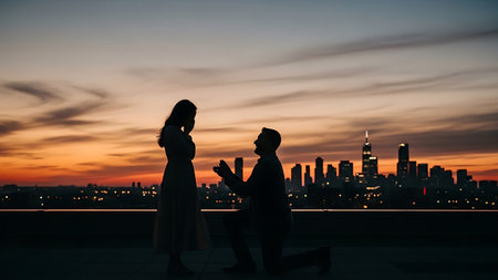 A Man proposes a woman to marry Silhouette at Sunset illustration generative ai