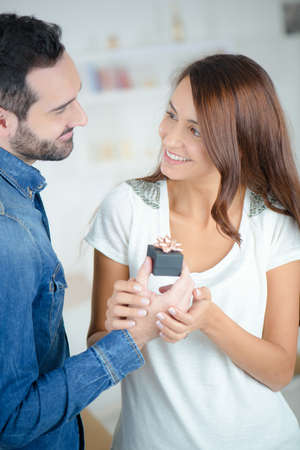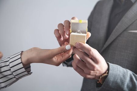 man giving gift box with engagement ring to woman. boyfriend making marriage proposal to girlfriend. Romance, birthday, anniversary, valentine, love, wedding concept