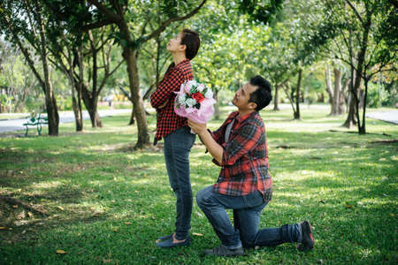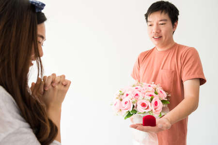 Handsome Asian man surprising propose to marry by giving red ring box and flower bouquet to his girlfriend.