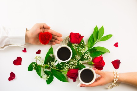 Marriage proposal with pearl ring in man hand, red roses and woman hand with coffee