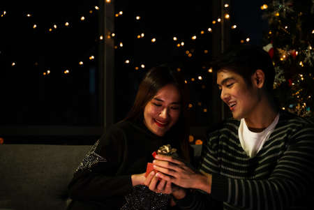 Valentine's day concept, young couple woman and man having love and romantic happy together, present a gift box to girlfriend or boyfriend, Social distancing by stay isolated living at home