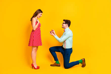I say yes. Full body profile photo of pretty lady handsome guy proposing girlfriend stand knee hold diamond ring box wear red dress shirt bowtie isolated yellow bright color background