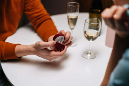 Concept of engagement proposal. 2021 Valentine and wedding celebration. Focus at hand.