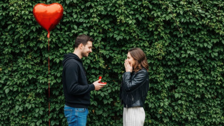 A man proposes to a surprised woman with a heart balloon in the background.