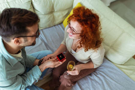 Smiling man holding red box with marriage engagement ring and make proposal to happy girlfriend.