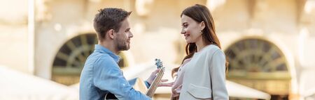 panoramic shot of handsome man playing guitar for beautiful girlfriend on street