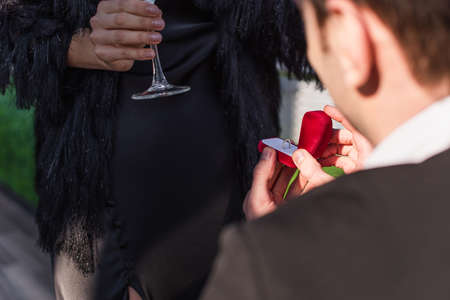 partial view of man making proposal to woman outdoors