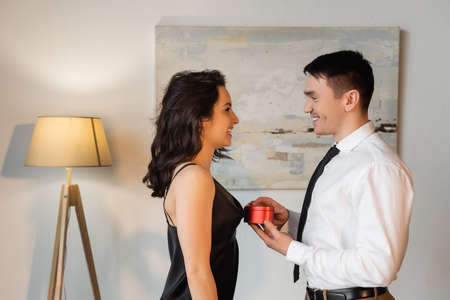 side view of man holding heart-shaped gift box near happy girlfriend in black slip dress