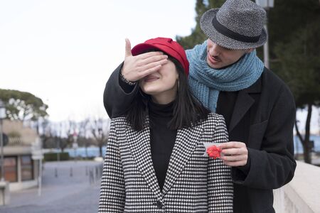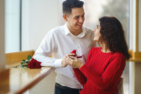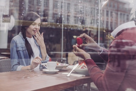 Beautiful young woman happy to receive the engagement ring from her elegant boyfriend .. Valentine's Day.