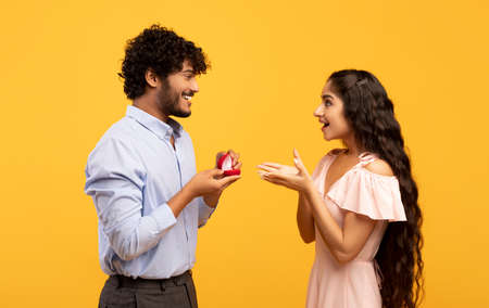 Passionate indian man proposing to his beloved lady, giving her engagement ring on Valentines Day, yellow background
