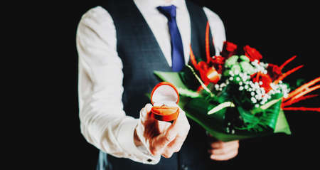 Diamond ring propose. Young happy man holding red gift box with diamond engagement ring, red roses bouquet. Engagement marriage ring