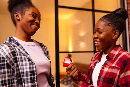 multicultural woman making proposal to her girlfriend in pajamas together in room at evening , Lgbt relationship concept