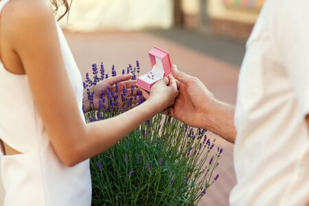 Pleasant moment of engagement. Cropped image of man putting on engagement ring on his wife finger while standing outdoors. Marriage proposal concept. Man and woman engaged. Romance of couple in love.