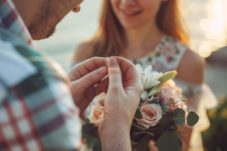 Man putting engagement ring on finger of his lover