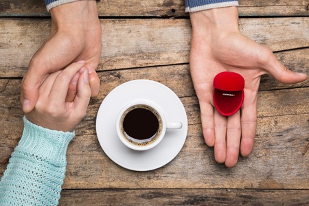 Man gives gold ring to woman as engagement or anniversary gift with cup of coffee. People dating coffee background