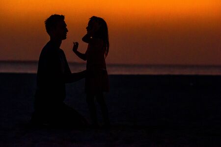 Silhouette of little girl and father in the sunset at the beach