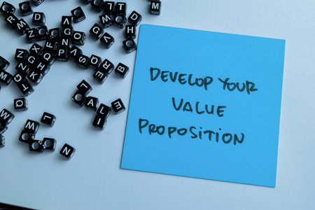 Concept of Develop Your Value Proposition write on sticky notes isolated on Wooden Table.