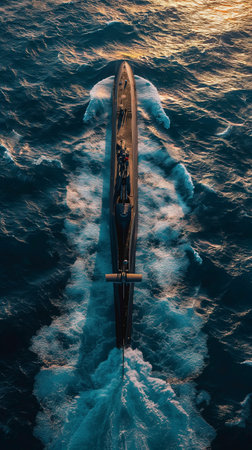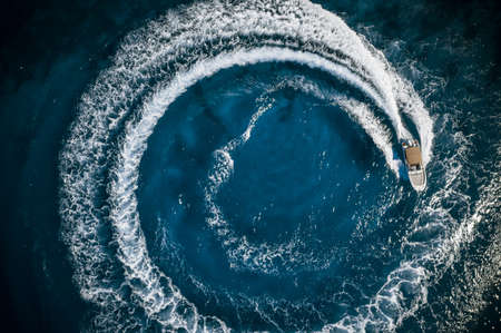 An overhead perspective reveals a white boat cutting through dark water, creating foamy wakes. The composition highlights the vessel's movement, with the sun casting highlights on the water. Suitable for illustrating travel, leisure, or transportation concepts, this image offers potential for diverse commercial applications.