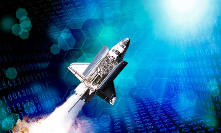 Rocket launch. Rocket with smoke flies into space. Space Shuttle. Spaceship begins the mission.