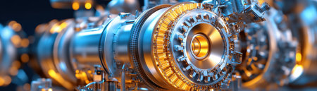 This image showcases a high-detail close-up of a futuristic industrial engine, highlighting the intricate components and shiny metallic finish under soft dim lighting.