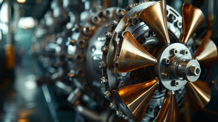 Close-up detail of a powerful jet engine turbine, showcasing intricate metalwork and complex mechanics. This image represents cutting-edge aerospace engineering, industrial technology, and the power of modern aviation. Ideal for illustrating themes of innovation, manufacturing, and high-tech machinery.