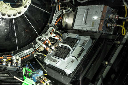 Close-up view of the engine of a jet engine. industrial background