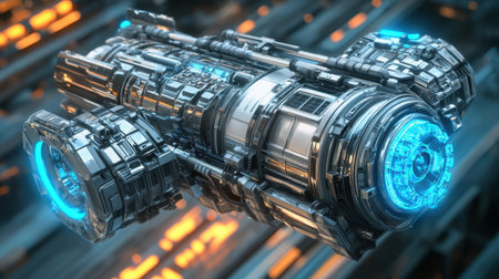 A stunning depiction of a futuristic engine featuring vibrant neon lights and intricate mechanical details, set in a high-tech sci-fi environment.