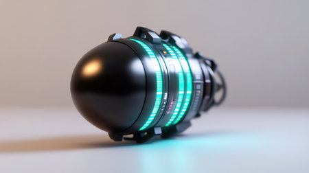 A sleek, black futuristic device with vibrant blue-green glowing lights, possibly a technological gadget or energy source.