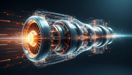 This image features a futuristic engine technology with vibrant orange and blue digital interface visuals, showcasing intricate data representations and innovative design elements.