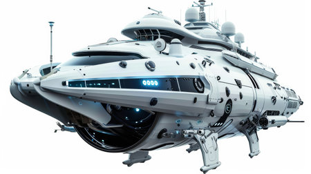 Captivating futuristic spacecraft design featuring a shiny metallic surface with glowing blue lights, perfect for sci-fi themed projects and illustrations.