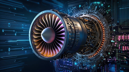 A jet engine is shown in a futuristic setting with a lot of technology surrounding it. Concept of innovation and progress, as well as the potential for future advancements in aviation technology