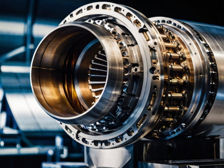 A close-up of polished metallic parts with intricate bolt arrangements and interconnected piping, showcasing advanced engineering craftsmanship and industrial innova