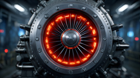 Close up of a futuristic turbine rotating with glowing red lights, showcasing advanced technology in an industrial environment