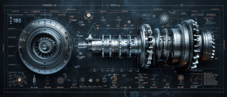 Explore a detailed illustration of vintage machinery with intricate components and blueprint elements, showcasing the blend of art and technology in engineering design.