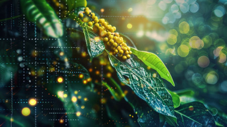 Close-up of a coffee plant with green leaves and digital overlay, symbolizing agriculture, technology, and sustainable farming.