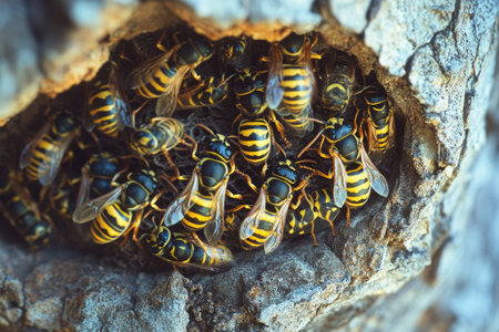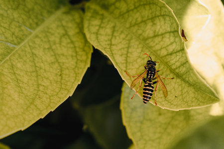 A vivid yellow and black wasp captured in mid-flight, highlighting the intricate details of its structure. This stunning macro image emphasizes nature's beauty and complexity.