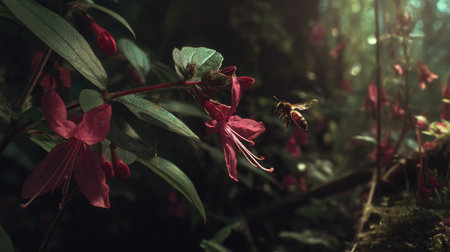 A captivating scene of pink flowers blooming in a lush forest, with a bee hovering nearby. This image embodies the essence of nature and pollination, perfect for nature lovers.