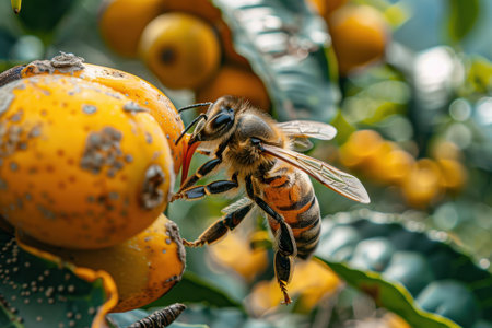 Behold the symbiotic dance as a diligent bee pollinates a delicate loquat flower, cloaked in the verdant embrace of a flourishing garden This intimate portrayal captures the crucial ecological role of insects and showcases the vibrant beauty of fruit trees in their natural splendor AI Generative