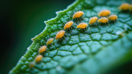 This macro image captures a yellow insect on a leaf surrounded by aphids, showcasing intricate details of nature and life in a vibrant ecosystem.