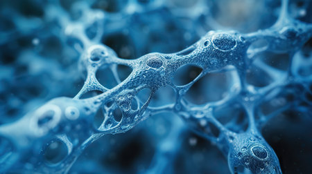 Microscopic view of an abstract cellular structure with a deep blue color palette suggesting scientific concepts.