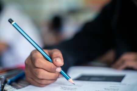 Hand of Student doing test or exam in classroom of school with stress