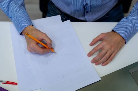 Close up , male with beard , holding pencil exams writing in classroom for education test ,Copy space for your text.Vintage tone with sunset light ,Education concept.