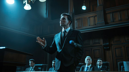 A poised man lawyer addresses the courtroom, showcasing confidence and professionalism in a formal setting. Generative AI