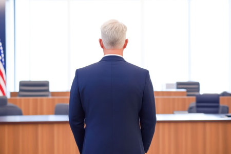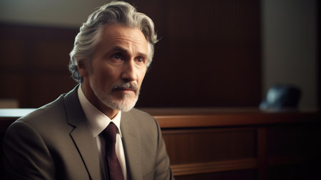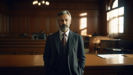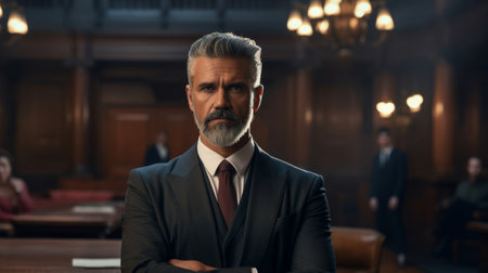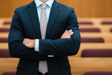 Confident businessman in a suit standing with crossed arms in a courtroom setting, conveying authority and professionalism, against a wooden background