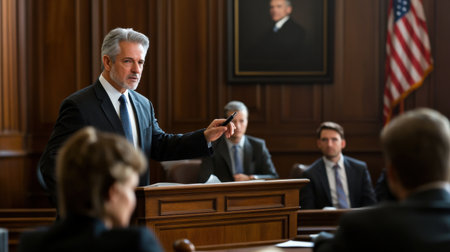 A lawyer standing in a courtroom, presenting a case to a judge and jury