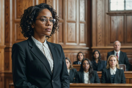 In a quiet courtroom, a Black man stands confidently before the judge's bench, embodying dignity and the pursuit of justice.