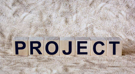 The word project in wooden cubes, blocks on the topic of business, education, development and training on a sandy background.